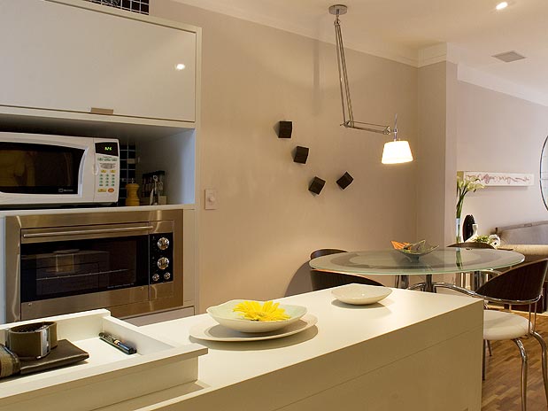 Donos de casas e apartamentos pequenos devem tomar cuidado para que a cozinha americana não pareça menor do que já é. Cores claras conferem amplitude, como se pode observar no projeto da designer de interiores Jóia Bergamo.
