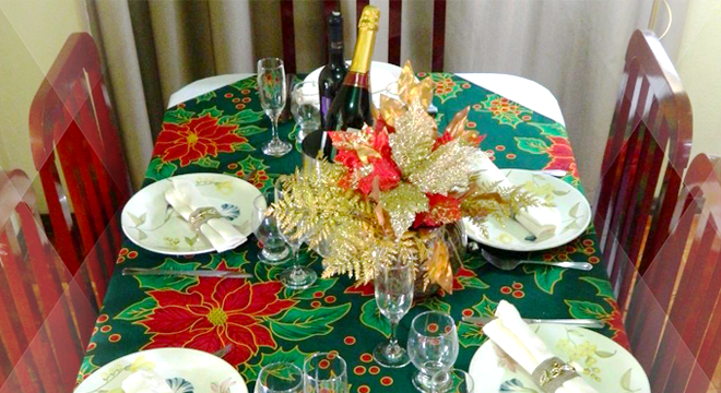 2 – Por cima, coloque uma sobretoalha ou trilho colorido, com motivos natalinos.