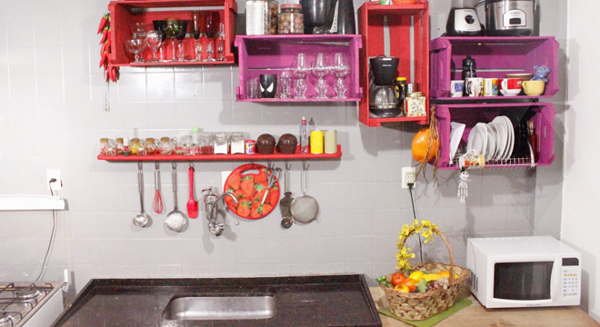 Avalie o espaço que tem de armários, paredes e teto e utilize esse potencial. Disponha em pontos da parede próximos ao fogão e a pia, ganchos que recebam panelas e utensílios, assim eles podem ser localizados rapidamente. Instale prateleiras onde outros utensílios podem ser colocados.
